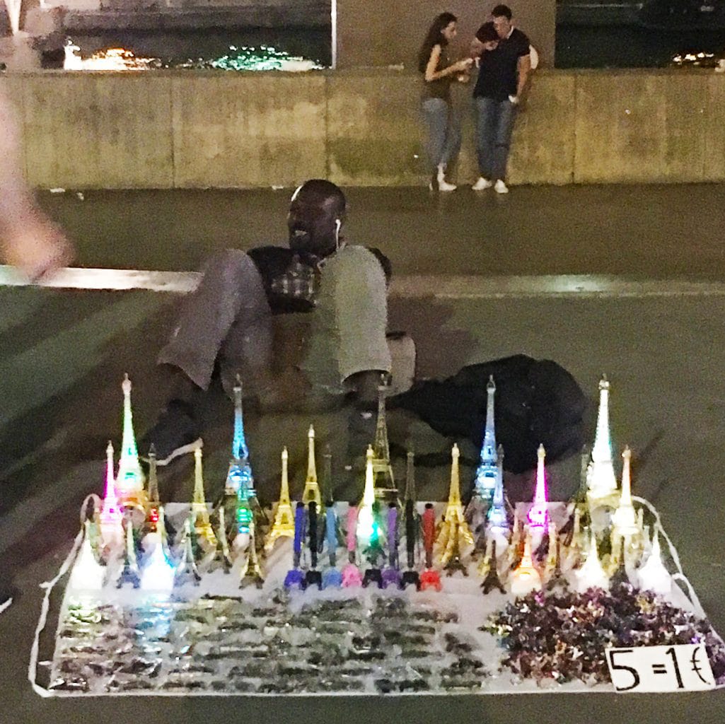 I still wanted to get up close to the Tour Eiffel, so more Metro and walking the long boulevards. It was nearing midnight and the place was really crowded and the air so humid. The tower was blocked off with temporary high-fencing and armed guards were all around it. Such a shame, so much has changed because of the Islamic attacks, it seems like the city is now in a permanent kind of low-level, lock-down mode – they’re not taking any chances. Paris seems to be full of people who look like they aren’t there for the cafés and the culture – they’re just milling around, looking a bit out of place . . nothing to do, just looking . . looking at you, trying to sell you a souvenir with a flashing light.